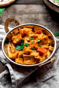 - After 45 mins remove from heat add your cherry tomatoes your coconut milk and lemon balm return to the heat simmer for a further 5-10 mins top with the coriander leaves then serve with a bowl of Basmati Rice.
